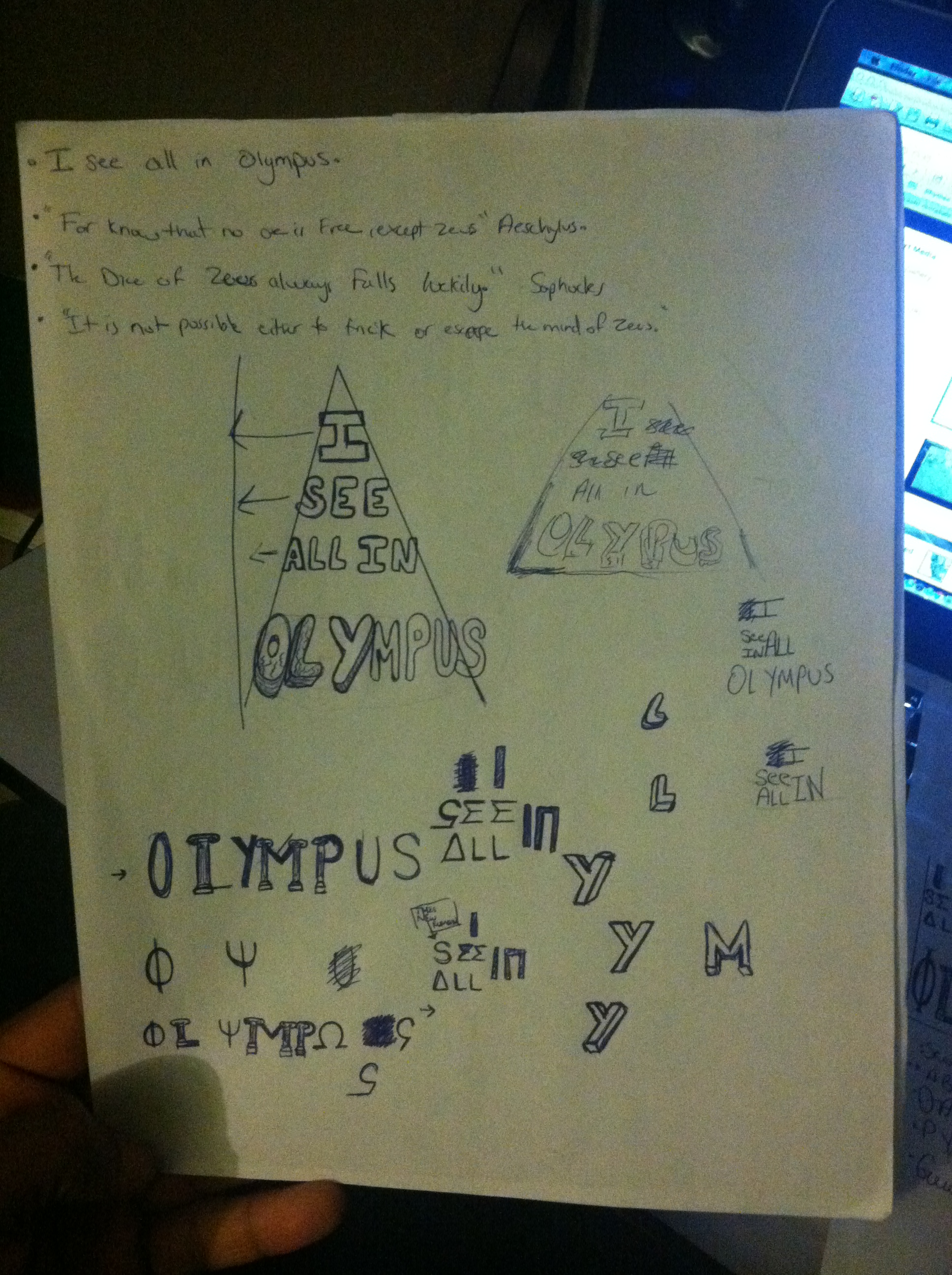 Working With text and images this week. I wanted to do something from scratch, my own image and a font i would manipulate in inDesign. I still think I’m in the development stage I’ve come up with a lot of possible ways. I’m just somewhat stuck but I believe it’ll work out in the end. I tried manipulating the color to stay subtle and blend in with the image. Ive done alot of brainstorming on this text and image. I messed around with the Olympus logo in illustrator at first, you can see in the one with the columns for some parts of the letters. Then i tried to to mess around in InDesign, and downloaded some fonts that would complement the image like a greek toned font. That is what i felt strong with the Lettering with the cracks in it, but the splattered one adds a faded sense on the tones paper which i also like.